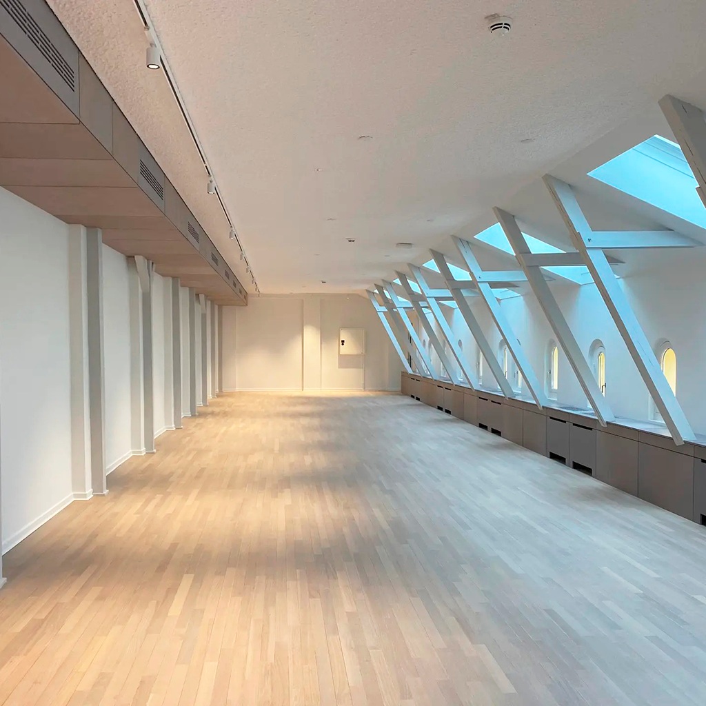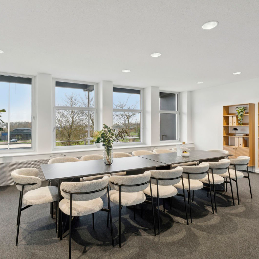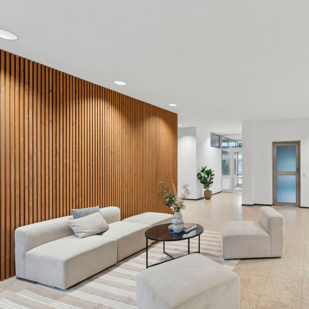 Akustikskiva bestående av återvunnet textil och glasgranulat. Efterbehandlas med vår akustikputs.