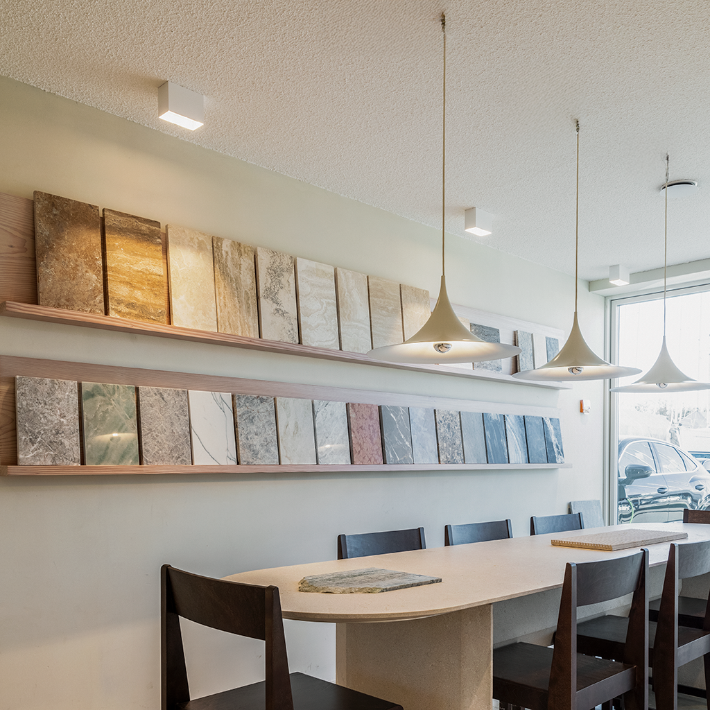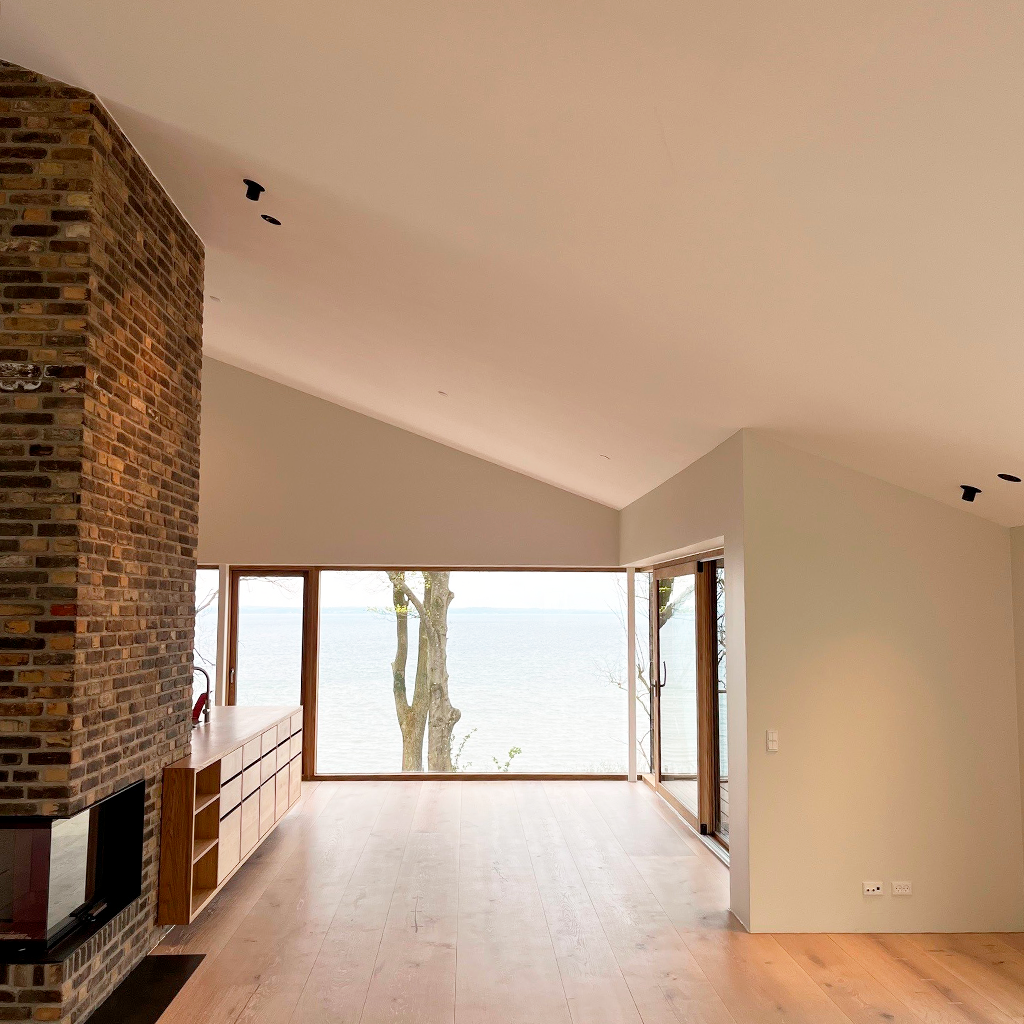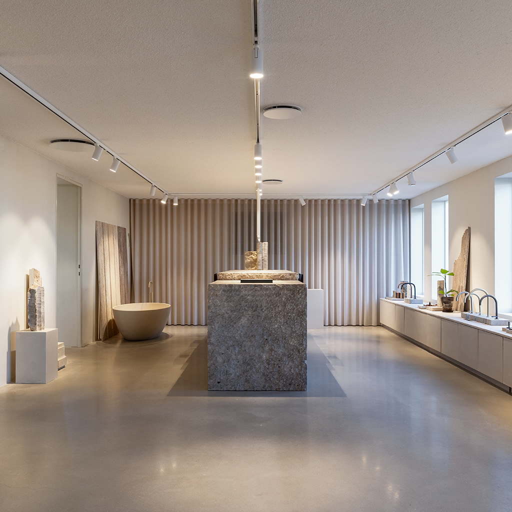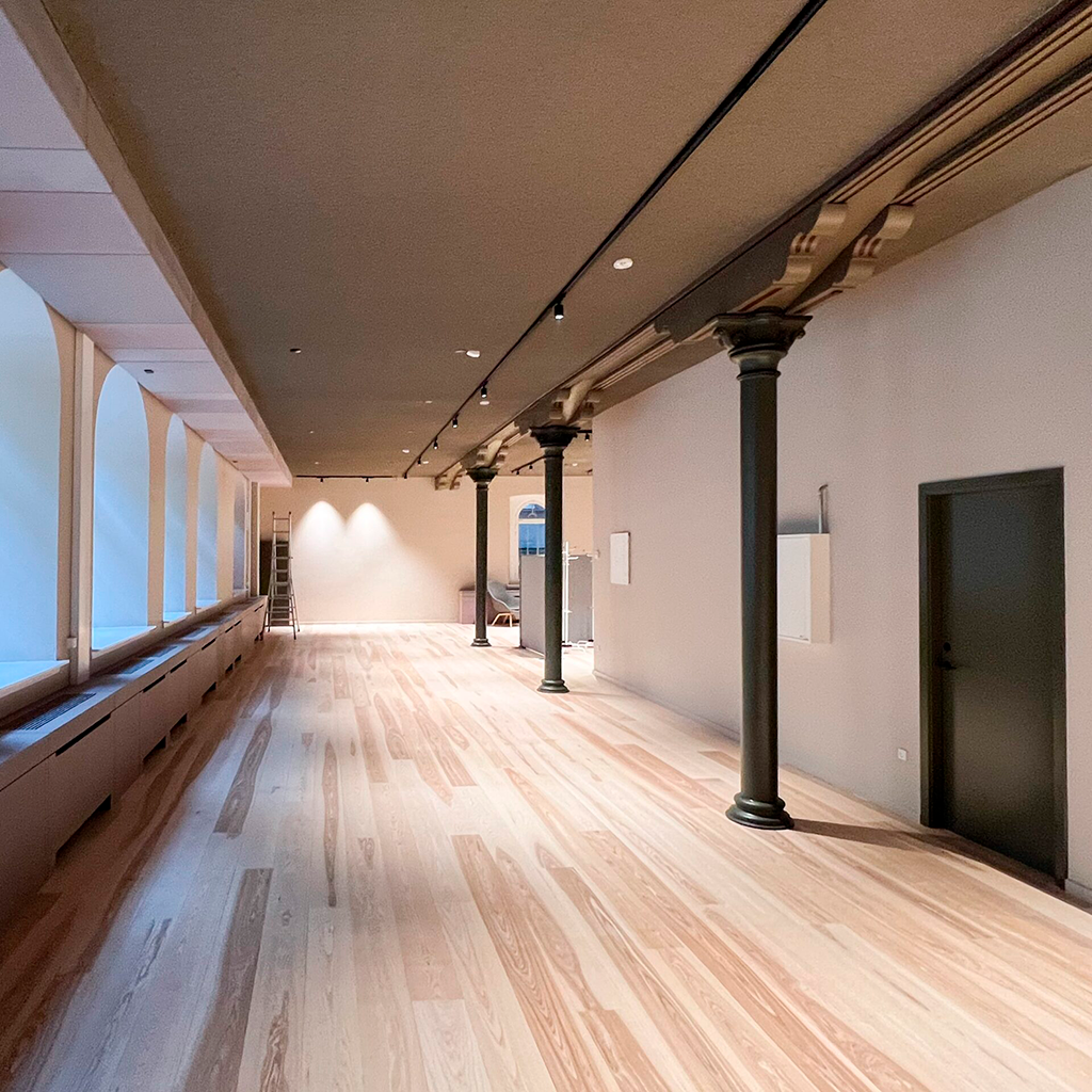 Akustikskiva bestående av återvunnet textil och glasgranulat. Efterbehandlas med vår akustikputs.